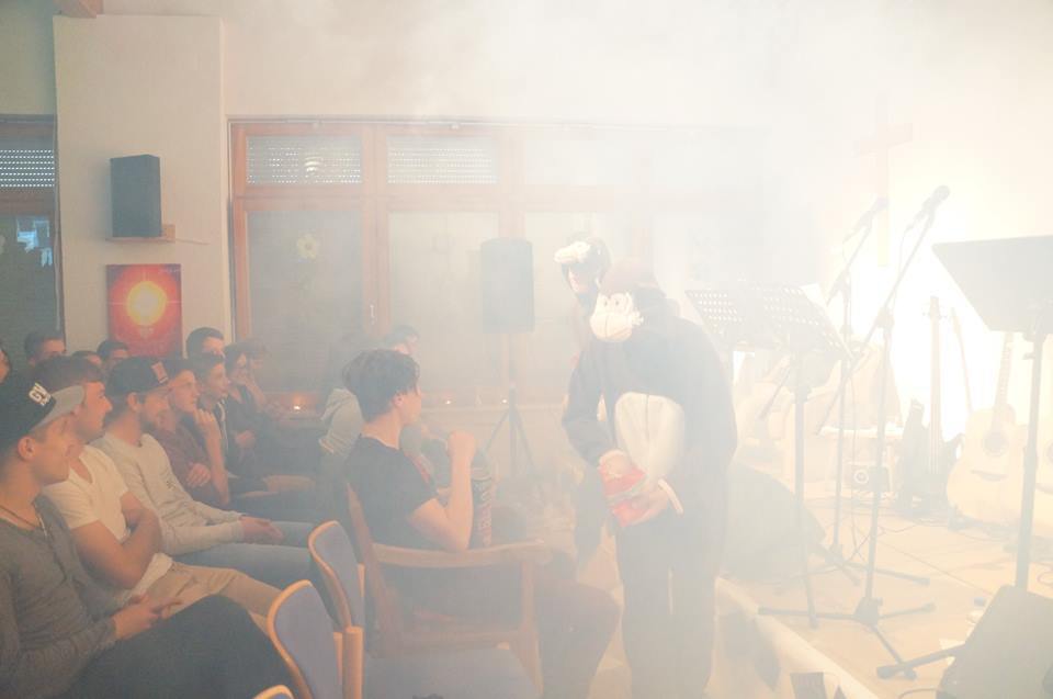 Schon um neun Uhr trafen sich die Ersten, um dieses Hammerevent vor Ort vorzubereiten. Verschiedenste Matertialien wurden schon im Voraus von überall her angekarrt und so hieß es die Bühne, die Instrumente, die Soundtechnik, die Lichter, einen Seelsorgeraum, die Küche, die Kirche nebenan und letztendlich natürlich den Saal mit Bestuhlung herzurichten. Im Teamwork konnten alle Arbeiten sogar schneller als geplant verrichtet werden und bei unerwartet hohem Besucherantrum wäre sogar noch eine Übertragung des Gottesdienstes in die Kirche möglich gewesen. Um 19 Uhr wurde das Gemeindehaus geöffnet und ca. 80 junge Gäste aus Igelsloch, Oberkollbach, Altburg, Liebenzell ... und natürlich Würzbach versammelten sich, um gemeinsam Gottesdienst zu feiern. Ein wunderschönes Gefühl schon für alle Beteiligten im Voraus, dass so viele Leute kommen, um zu erleben, was vorbereitet wurde. Im Stile der Fernsehsendung Circus Halligalli wurden die Gäste mit einem Witz begrüßt und Gott wurde in Liedern der Band Freed Indeed gemeinsam gelobt. In einem anschließendem "Wenn ich du wäre" wurden Schokoküsse in Gesichter gedrückt, Kaffe aus Sockenfiltern getrunken und Wäscheklammern im Gesicht befestigt, um den Gottesdienst in der ersten Reihe in einem vollausgestatteten StuhlStuhl zu verbringen. Diese humoristische Einlage bereitete aber gleichwohl genau wie ein Anspiel darauf hin, wie weit wir für Jesus gehen können. In der Predigt wurde darauf hingewiesen, dass ein Leben mit Jesus zeitweise sehr fordert und wir immer wieder aufs Neue herausgefordert werden, an Grenzen zu gehen und diese zu überwinden. Egal ob Neuling oder alter Hase im Glaube kann ein solchens "wenn ich du wäre" mit Jesus, dem Leben nicht nur einen Sinn gbeen, sondern es zum größten Abendteuer überhaupt machen. Nach der Predigt wurde nochmals gesungen und in die Gruppen und Kreise in Würzbach und Igelsloch eingeladen. Beim legendären Aftershowprogramm war sowohl halligalli bei Tischkicker, Billiard, Photo Booth, Hannatattos, einer Mohrenkopfschleuder oder Hau den Sven, als auch Tiefgang in persönlichen Gesprächen, im Seelsorgeraum oder im Gebetsparcour in der Kirche nebenan angesagt.